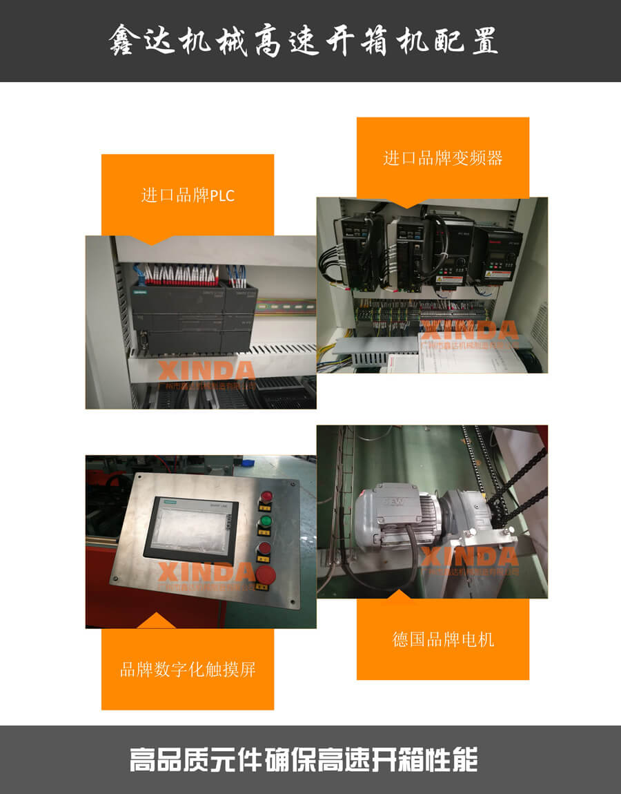 鑫達機械高速開箱機目前速度分為12箱立式開箱機、15箱臥式開箱機、25箱臥式開箱機、35箱臥式高速開箱機以及45箱高速開箱機5種速度型號,其中立式開箱機是采用吸盆吸取成型、皮帶傳輸;而臥式高速開箱機統(tǒng)一采用進口德國品牌SEW電機傳動、臺灣臺達伺服電機成型、德國費斯托真空吸盆,自強鏈條品牌傳輸、西門子PLC核心控制系統(tǒng);以上高品質(zhì)零配件確保了鑫達機械高速開箱機的持續(xù)開箱能力達95%以上,紙箱損壞率在千分之一以內(nèi),采用此款高速成型機,確確實實的保證了客戶的耗材成本。